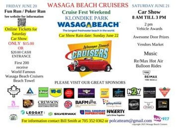 Registration will begin around 1:00 and first cars should be out by 1;30. As in the past, the cost will be $5:00/hand. This year's Poker Run will be in the Wasaga Beach area . We want to support our local community and our Town. Andy Payne and his team have put a great route together that will give our visitors and locals the opportunity to enjoy the longest freshwater beach in the world.